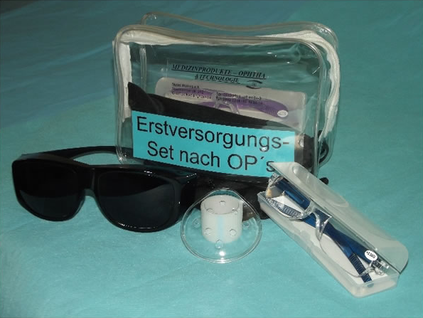 Inhalt: 1 Leserbrille 2,5 Dpt. 1 getönte Schutzbrille 1 Augenklappe – 9-Loch – transparent 1 Tape-Rolle zur Befestigung der Augenklappe |